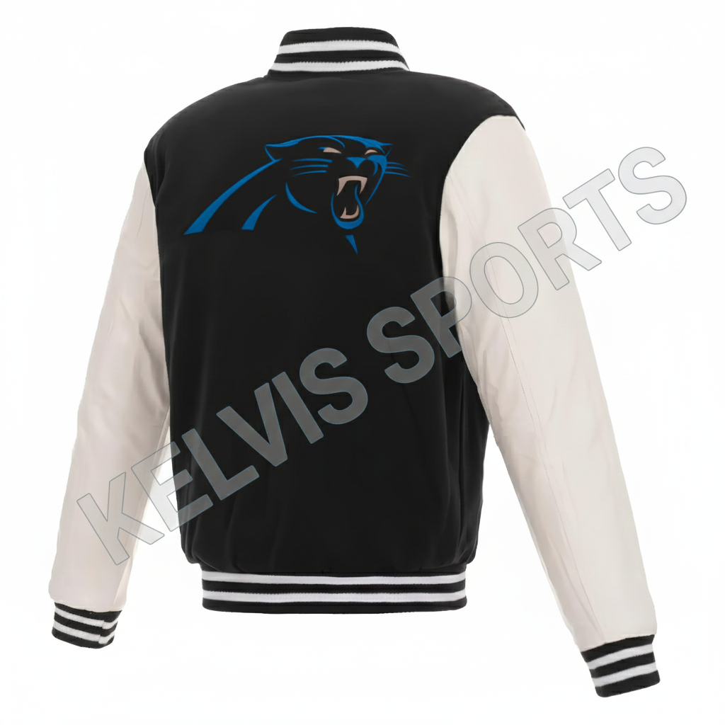 NFL Carolina Panthers – Black Body White Leather Sleeves Jacket – Available in All Sizes
